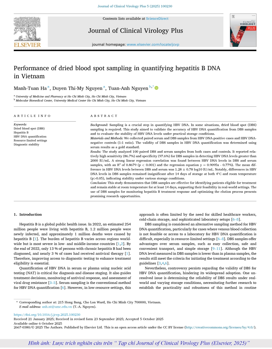 Một nghiên cứu mới của nhóm tác giả Trường Đại học Y Dược TP. Hồ Chí Minh và Bệnh viện Đại học Y Dược TP. Hồ Chí Minh – Cơ sở 2 vừa được công bố trên Tạp chí Journal of Clinical Virology Plus (Elsevier, 2025) đã mang đến những kết quả đáng chú ý trong việc ứng dụng mẫu máu khô (dried blood spot – DBS) để định lượng HBV DNA ở bệnh nhân viêm gan B tại Việt Nam.